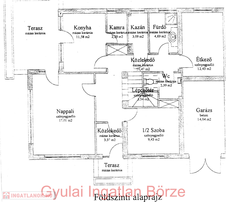 A nappali, az étkező és a szobák Belga portaszító és tűzálló padlószőnyegesek, a konyha, az előtér, a kamra,
