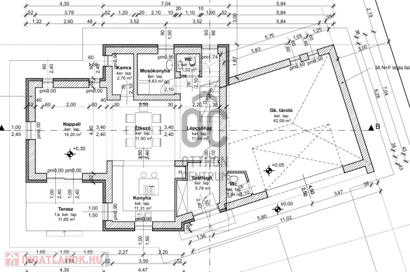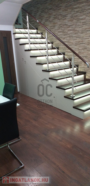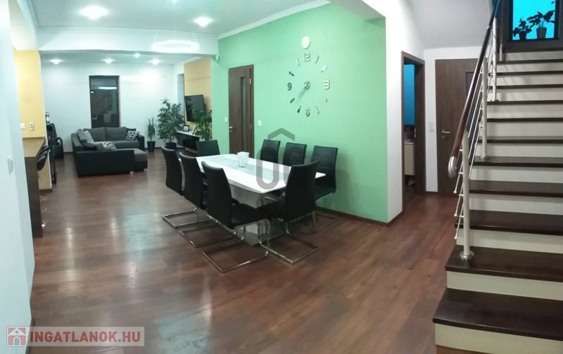 Az ingatlan 180 nm-es alapterületén a terek harmóniája ás funkcionalitása találkozik. A földszinten egy amerikai konyhás nappali - étkező uralja a tere, kifinomult elegancia és természetes fény uralkodik. Az előtéren keresztül a garázs megközelíthető, amely dupla férőhelyes, pontosan 42 nm-es és elektromos kapuval ellátott.