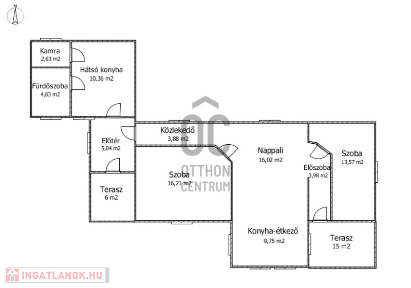 A házban két tágas szoba (16,21 m² és 13,57 m²), valamint egy nagy, világos, 25,77 m²-es konyha–étkező–nappali került kialakításra. Emellett található egy hátsó konyha (10,36 m²), fürdőszoba (4,83 m²) és kamra is, így a helyiségek elrendezése rendkívül praktikus.