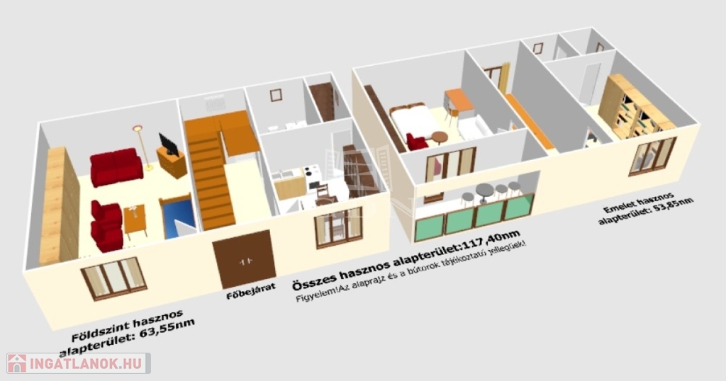 A főépület hasznos alapterülete 63,55+53,85= 117,40nm, melyben található: