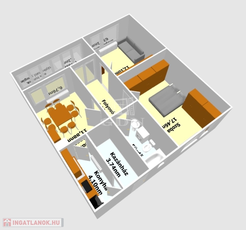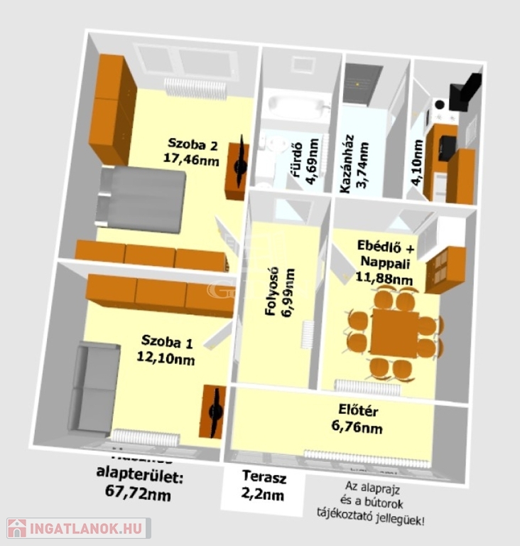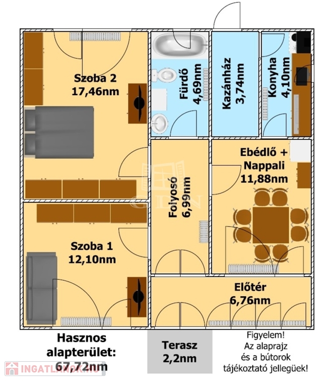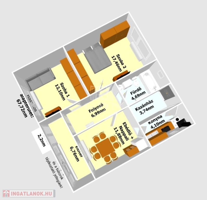 A főépület hasznos alapterülete 67,72nm melyben található: