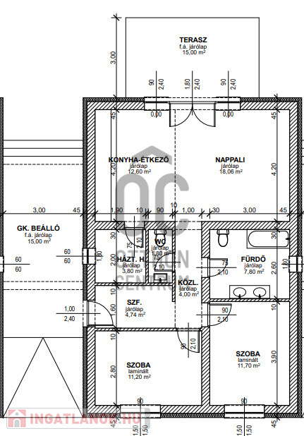 Az épület nettó 75 nm alapterületű, nappali+ 2 hálószoba.