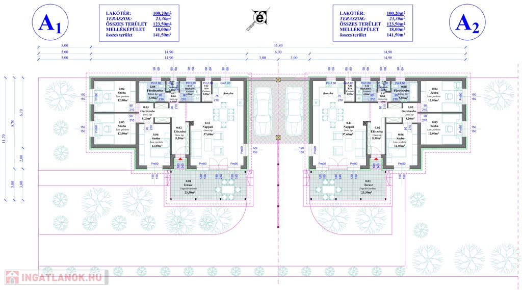 A telekre két ház épül, de semmilyen közös fallal az épületek nem érintkeznek, a két ház között a 18 nm-es fedett gépkocsi beállók helyezkednek el.