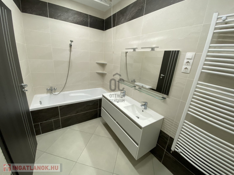 - Kád + zuhanyfüggöny, dupla mosdóval, törölközőszárítóval, WC-vel