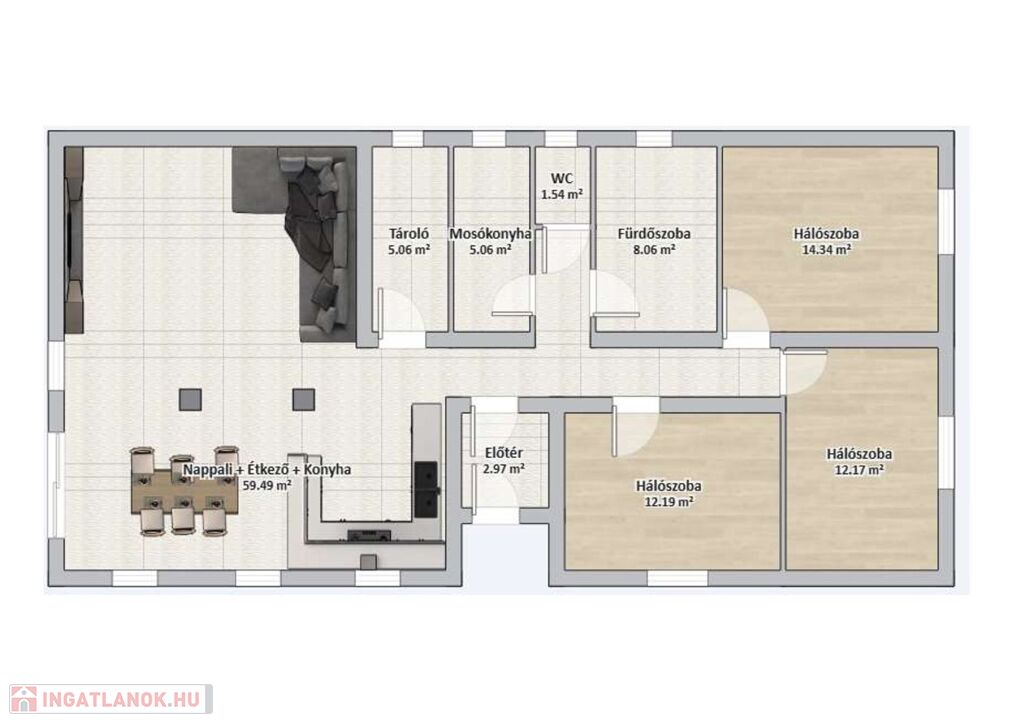 - 60 nm-es konyha + étkező + nappali egylégtérben