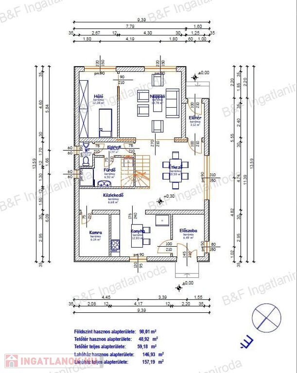 A földszinten tágas nappali–étkező–konyha, kamra, gardrób, fürdőszoba és külön WC található.