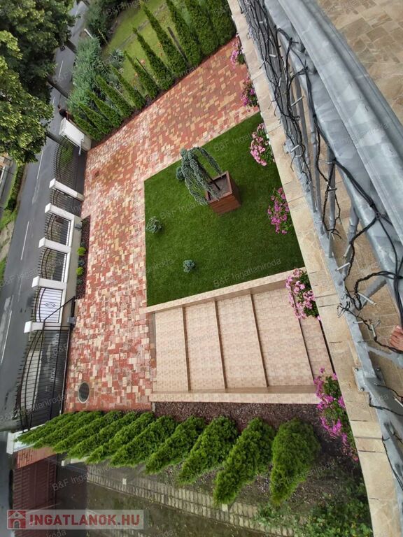 Az udvar nagyrészt térkövezett, több autó parkolására ad lehetőséget.