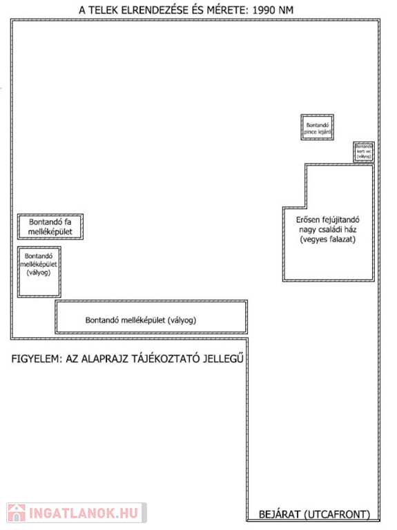 A ház állapotából adódóan erősen felújítandó vagy bontandó. Viszont ne feledjük, hogy egy nagy telek áll rendelkezésünkre, ahol a 35 % beépíthetőségi szabálynak köszönhetően megvalósíthatja álmait. Ha több család vagy generáció szeretne ide költözni, akkor a hely mérete bőven engedi ezt (akár ikerház is építhető).