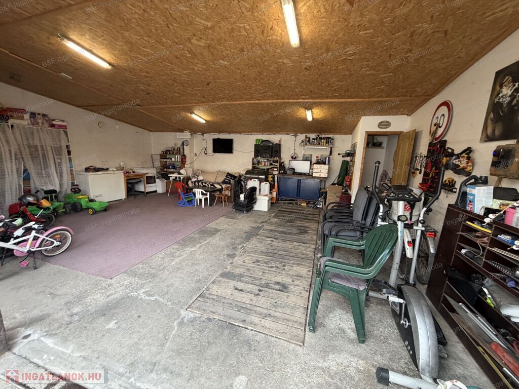 A telken található továbbá egy 40 m²-es téglából épült dupla garázs, amely kényelmes parkolást és tárolási lehetőséget kínál, és helyet kapott benne egy wc is.