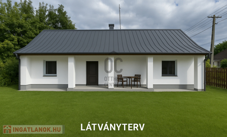 50 m²-es családi ház + 10 m² fedett terasz, 1072 m² telekkel eladó.