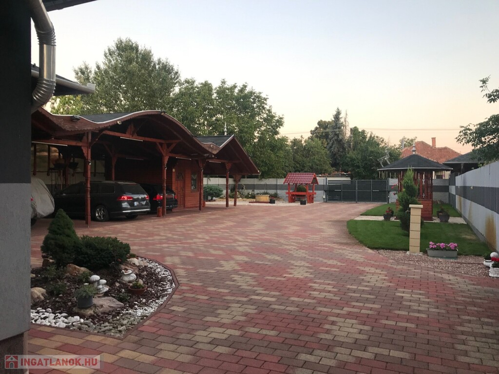 Udvar: 450 m2 teljes egészében viakolor burkolattal fedve, nagy előkerttel, 2 db sziklakerttel. 2 db elől-hátul lévő utcafronton elektromos nyíló kapu, fúrt kútról víz vételi lehetőség, gyepszőnyeg locsolására alkalmas elektromos öntöző rendszer – kútról ellátva vízzel (nem vezetékes víz).