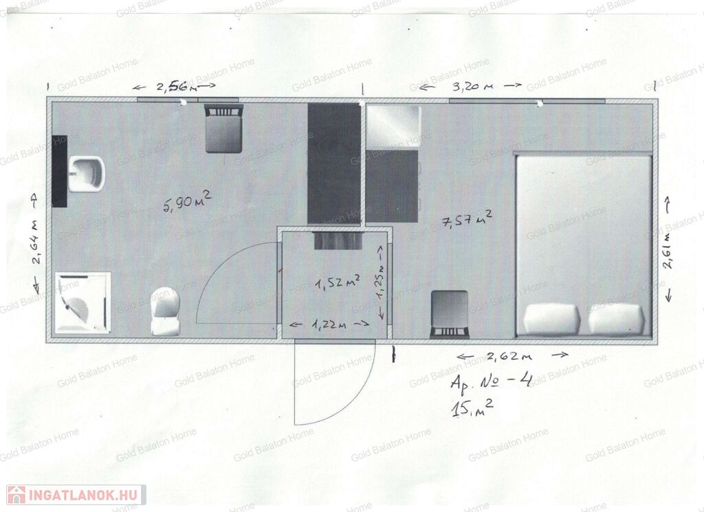 - apartman 4 (4 fő részére): 1 szoba minikonyhával, fürdőszoba zuhanyzóval+WC