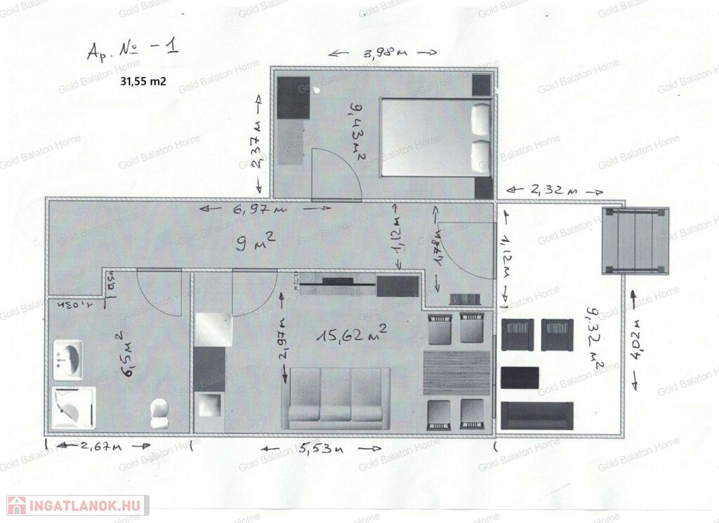 - apartman 3 (2 fő részére): 1 hálószoba, nappali-konyha-étkező, fürdőszoba zuhanyzóval+WC
