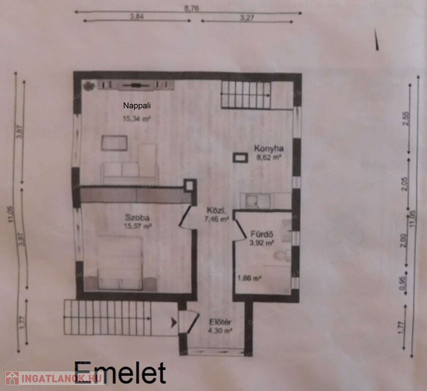 - emelet: előtér, közlekedő, hálószoba, amerikai konyhás nappali-étkező