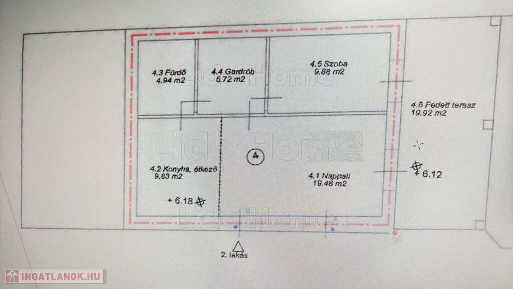 - 1-es lakás (50nm): nappali, konyha-étkező, fürdőszoba+WC, gardrób, szoba, 20 m2-es fedett terasz
