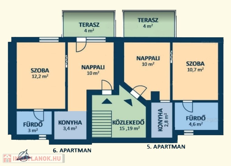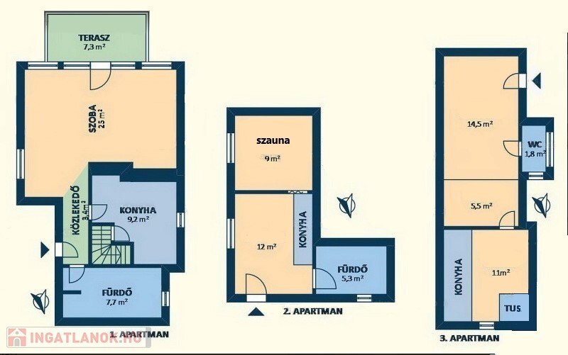 • Felső szint: Két külön apartman, mindegyik nappalival, konyhával és fürdőszobával.