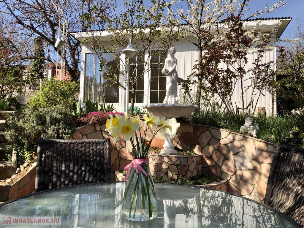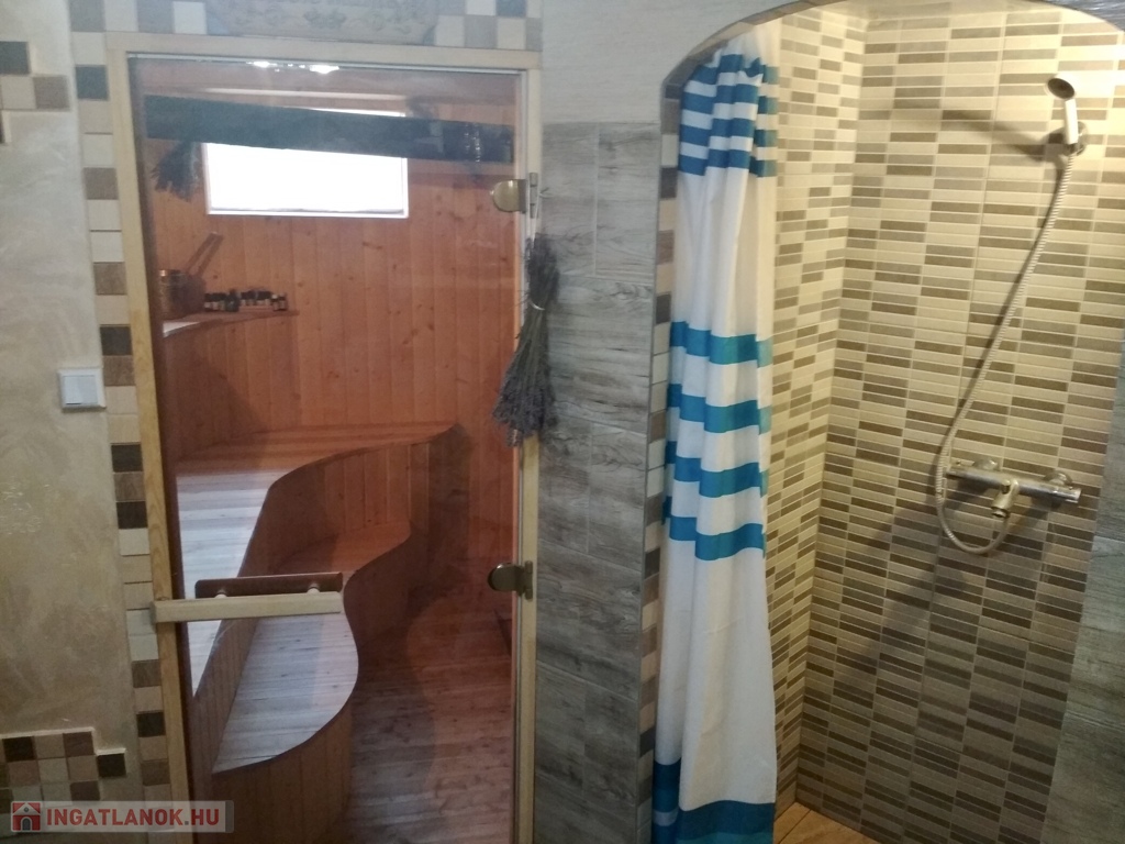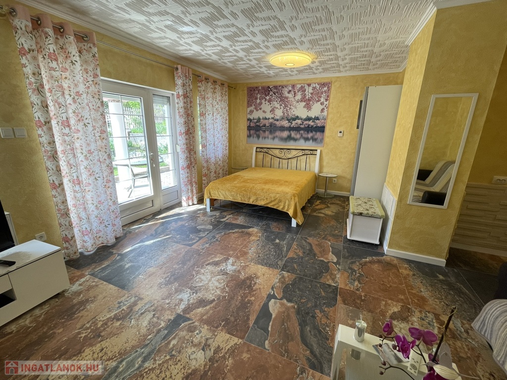 • Melléképület: A garázsból szaunát alakítottak ki, mellette pedig egy további, teljesen felszerelt apartman (szoba, nappali, konyha, fürdőszoba) is helyet kapott.