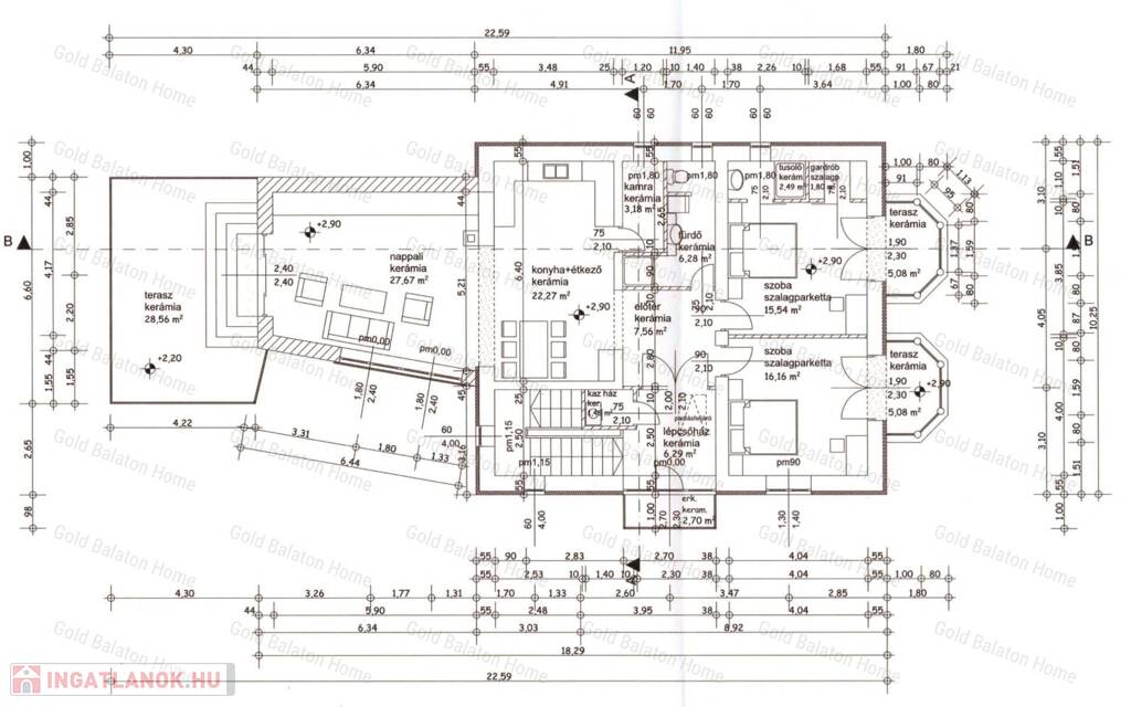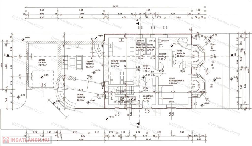 - Földszinti helyiségek: amerikai konyhás nappali 50,46 m2, szoba 24,2 m2, fürdőszoba 15,31 m2, gardrób 4,3 m2, mosókonyha 2,97 m2, külön WC 2,75 m2, kamra 1,9 m2, előtér 11,48 m2, lépcsőház 7,17 m2, terasz 19,18 m2, garázs 23,79 m2.