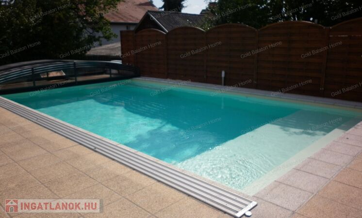 40 m2-es medence napozó terasszal a rendezett udvar ékköve. Fűthető, ellenáramoltatóval, víz forgatóval rendelkezik a gépészet.