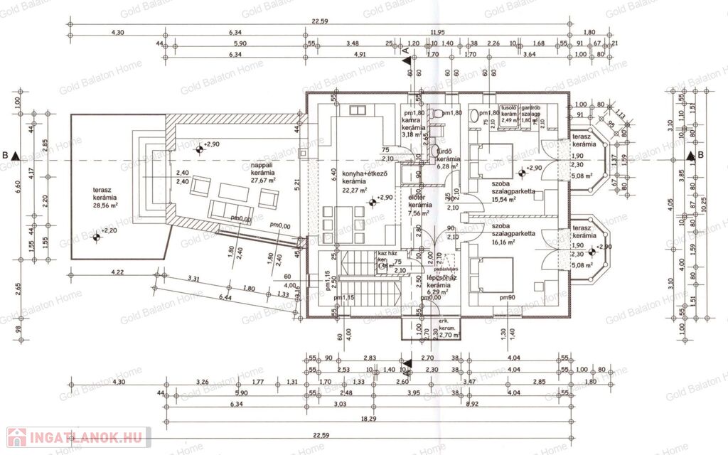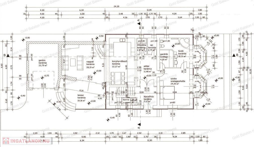 - Földszinti helyiségek: amerikai konyhás nappali 50,46 m2, szoba 24,2 m2, fürdőszoba 15,31 m2, gardrób 4,3 m2, mosókonyha 2,97 m2, külön WC 2,75 m2, kamra 1,9 m2, előtér 11,48 m2, lépcsőház 7,17 m2, terasz 19,18 m2, garázs 23,79 m2.