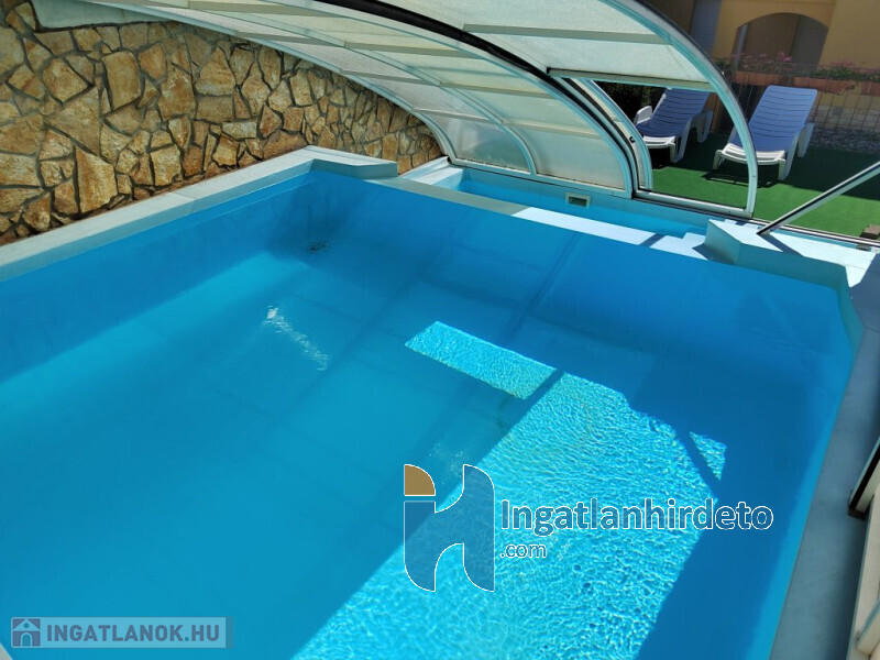 - Szabadtéri medence napozóágyakkal (méret: 6,3 m × 4,6 m, mélység: 60?135 cm)