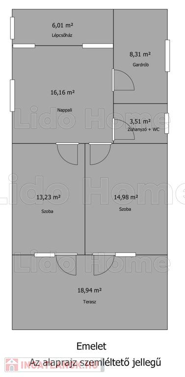 - földszint: WC, közlekedő, 2 hálószoba, konyha-étkező, nagy nappali, fürdőszoba + WC