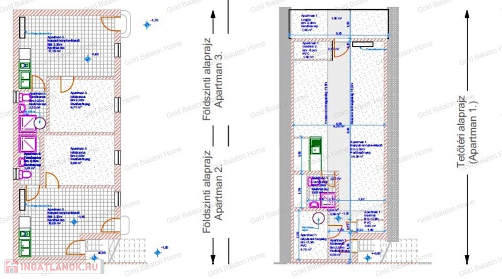 - apartman 1 és 2: konyha-nappali-étkező, zuhanyzó+WC, hálószoba