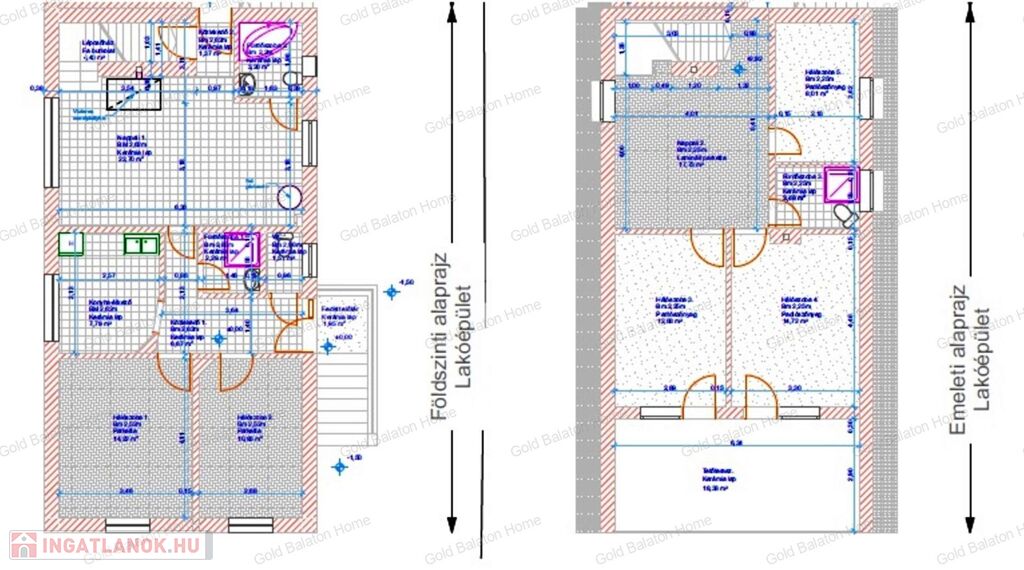 - földszint: WC, közlekedő, 2 hálószoba, konyha-étkező, nagy nappali, fürdőszoba + WC