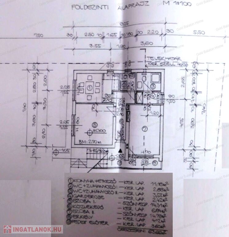 földszint (63,66 nm): 2 apartman (szoba, konyha - étkező, fürdőszoba zuhanyzóval és WC – vel, erkély)