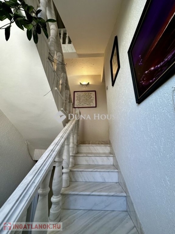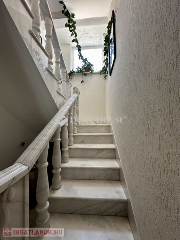 Az emeleti lakótér tágas és világos: nappali, konyha és étkező egy légtérben helyezkedik el, kiegészítve egy hálószobával és fürdőszobával. A padlástérben további három hálószoba, valamint egy fürdőszoba-WC található, így a ház nagyobb családok számára is kényelmes életteret biztosít. A szinteket elegáns márványlépcső köti össze.