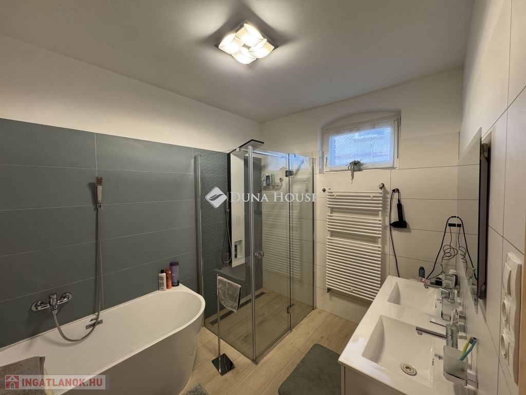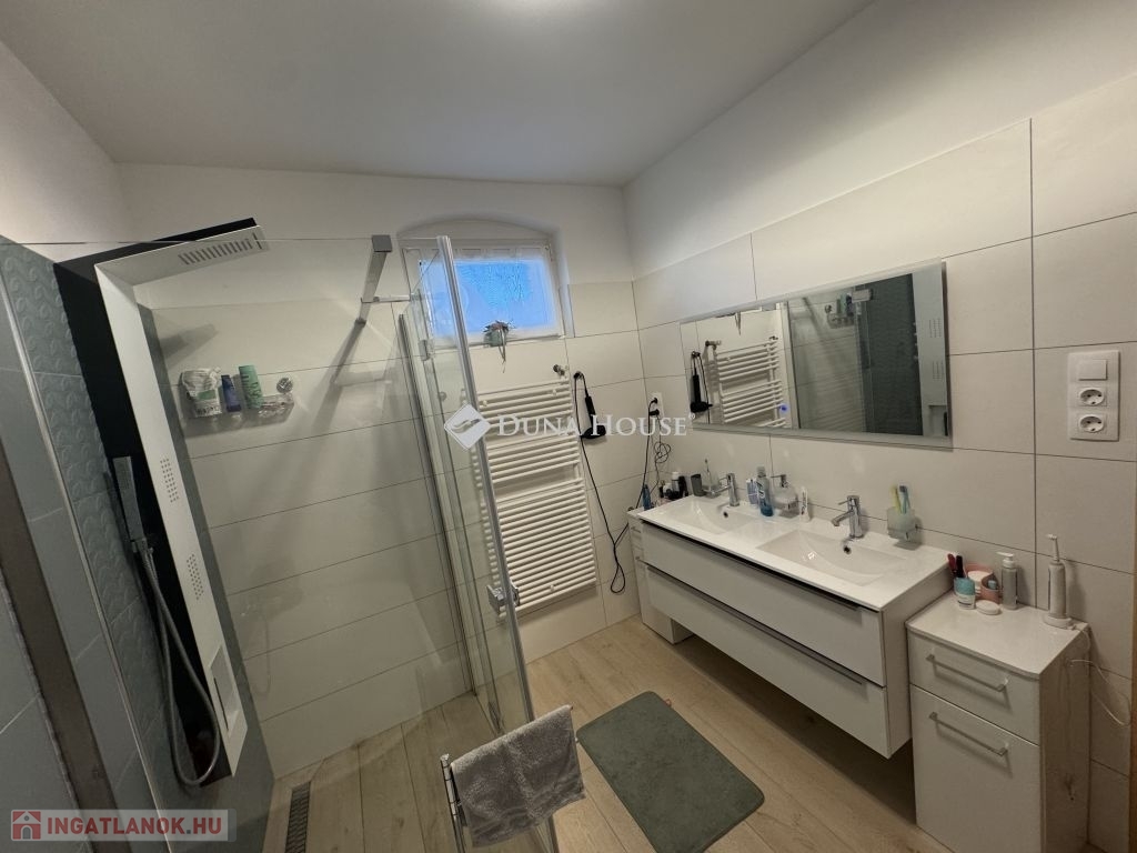 A három hálószoba és két fürdőszoba jól szolgálja a családos életet, míg az amerikai konyha nappali kialakítás könnyed, modern életvitelt tesz lehetővé. A fűtési rendszer és a napelemes megoldás révén energiatudatosan is élhető az ingatlan.