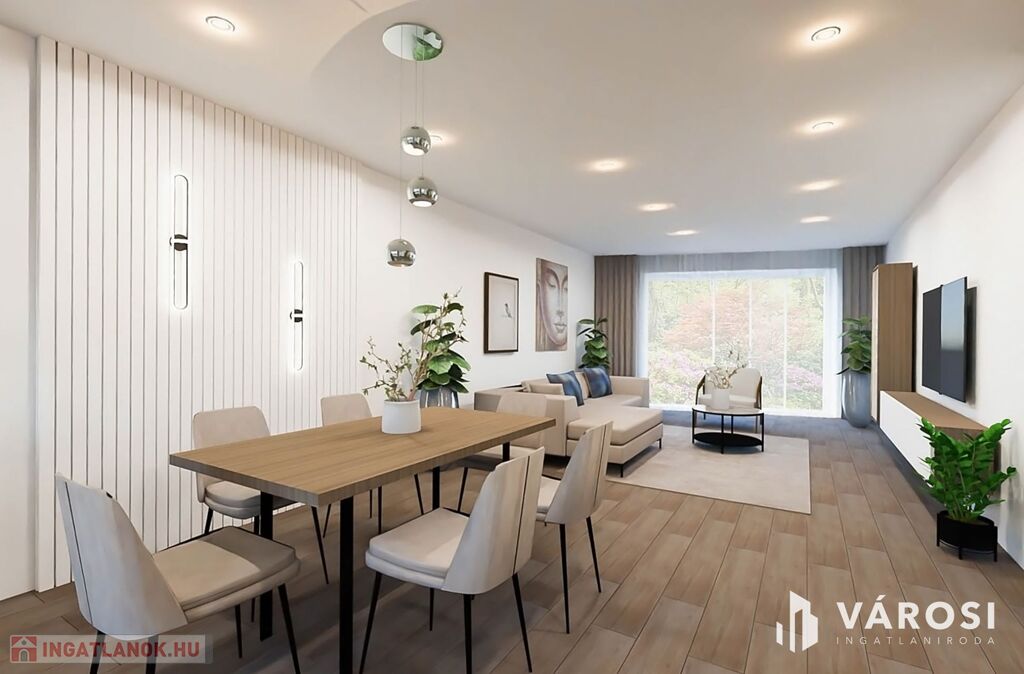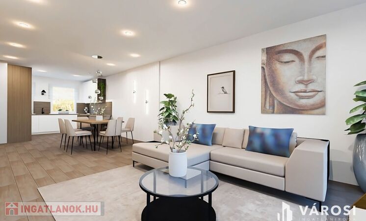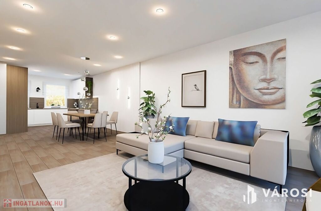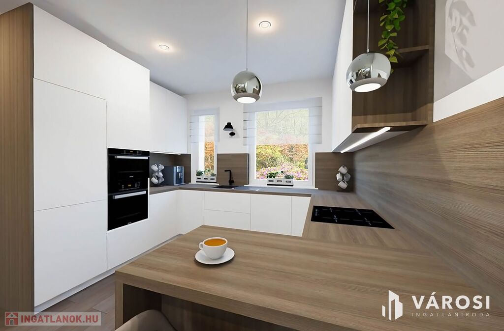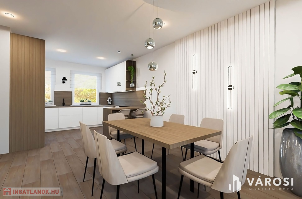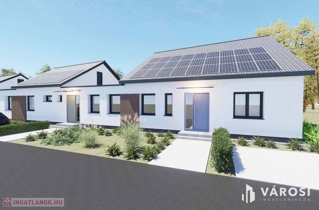 Eladó Hódmezővásárhelyen, Új-kishomokon a Mező utcában, új építésű 3 lakásos sorházban, 115,55 m2 hasznos alapterületű tégla ház. Az amerikai konyhás, nappali + 3 hálószobás ház remek tájolású, kényelmes életteret biztosít 4-5 fős család számára. Az ingatlanhoz ~ 420 m2 önálló kertrész tartozik, valamint társasház részére tervezett közös (6,00m x 3,00m) medence és napozótér.