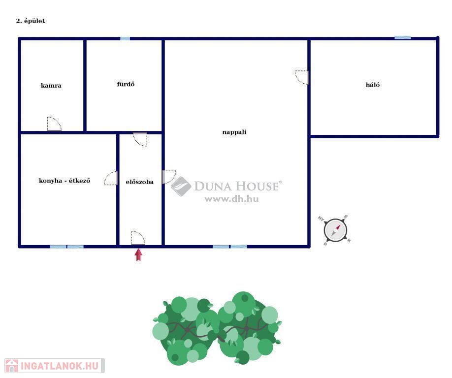 Elrendezés: nappali, háló, konyha-étkező, kamra, fürdő.