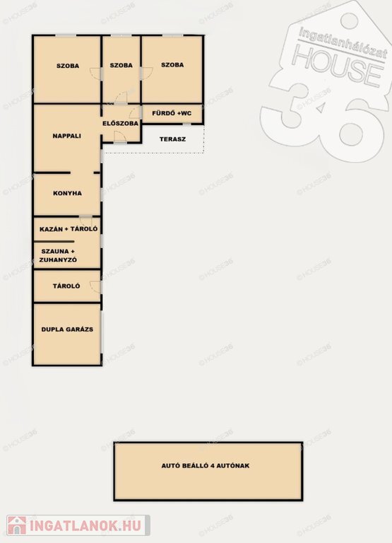 Dupla garázs és 4 gépkocsi beállására alkalmas fedett beálló