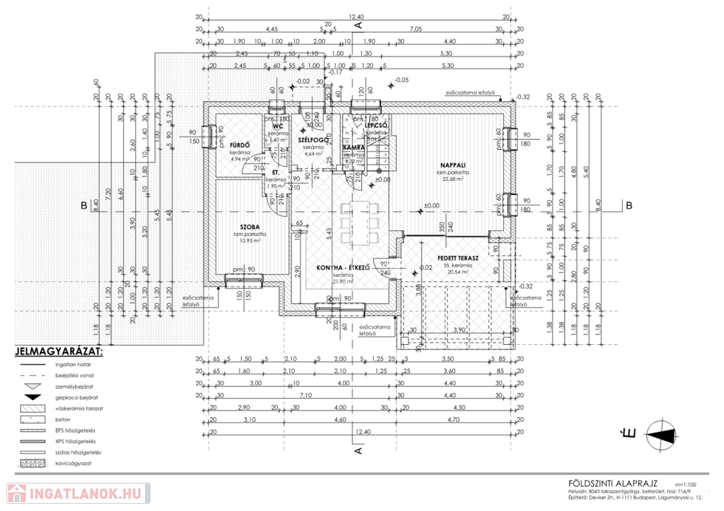 - Földszint: előtér, wc-kézmosó, tágas nappali- konyha-étkező,+ kamra, fürdő, fedett terasz (20m2)