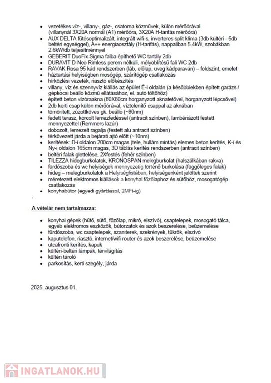 Az ingatlan összközműves, önálló helyrajzi számon lévő telekterületen az épület Porotherm 30 X-Therm téglából épült + 20cm szigeteléssel. A tető héjalása Terrán tetőcseréppel készült,. A fűtést szintenként szabályozható padlófűtés biztosítja. A melegvíz ellátás Heizer forróvíztároló biztosítja. A ház klimatizált , 5db beltéri egység található. A nyílászárók műanyag korszerű üvegezéssel, alumínium motoros redőnnyel ellátottak. A helyiségek burkolata, a beltéri ajtók, kapcsolók konnektorok… választhatók.