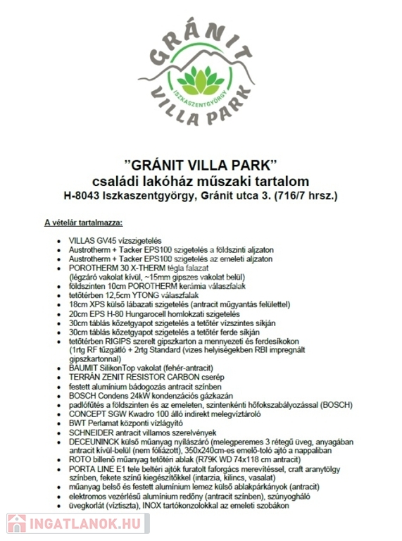 A Iszkaszentgyörgy-GRÁNIT Villapark, Székesfehérvártól csupán 5km-re, a Márványkert közelében található, 12 db önálló telken lévő 12 db önálló házzal rendelkezik, Házanként 152m2, 2 szint, saját telek (800m2- 925m2-ig), 20,5m2 terasz, minden ház 2 irányban tájolt, benapozott és átszellőztethető.