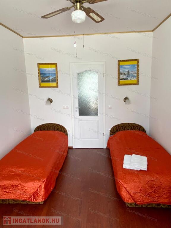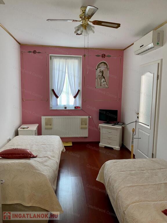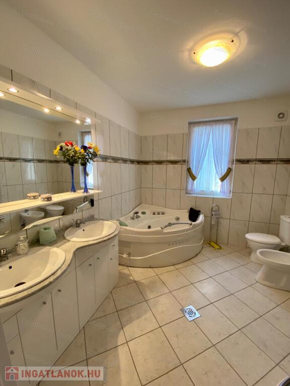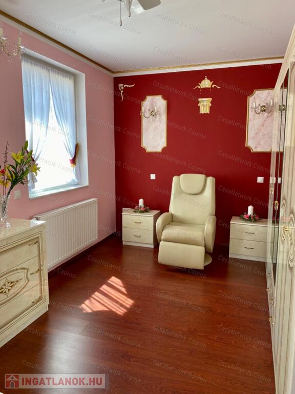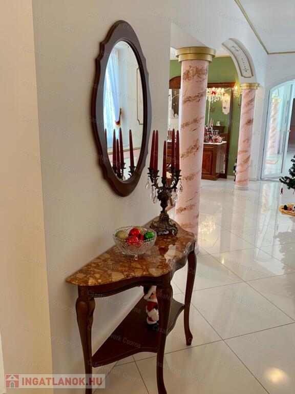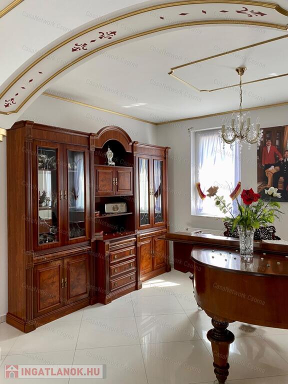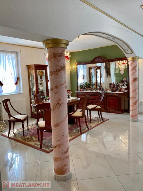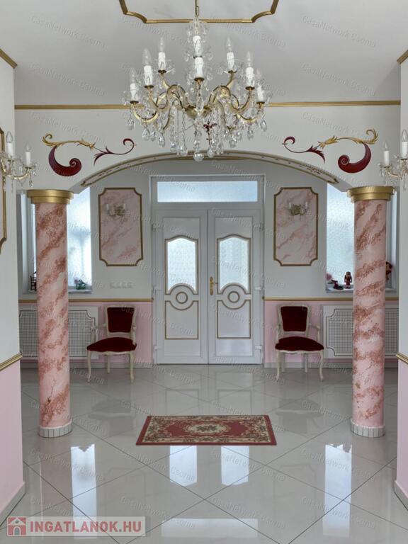A kastély 3 csillagos amerikai stílusú kastélyszállóként üzemelt, melyhez 5 szoba tartozik, 20 fő elszállásolására van lehetőség. A szobák az udvarból nyílnak, így a saját lakóterülettől függetlenek. Ezek a szobák üzemelhetnek újra szállóként, vagy: tárolóként, hobbiszobaként, vendégszobaként. Mindegyik saját fürdővel rendelkezik. Felszereltsége: tv, hűtő, ventilátor, asztal, főzőlap.A lakótér szintén amerikai stílusban készült el, 3 hálószoba fő hálóval mindegyikéhez tartozik fürdőszoba,plafon ventilátor, többségében klíma. Továbbá amerikai stílusjegyek szintén felfedezhetőek az amerikai dupla konyhában, mind a bútorzat, mind a gépesítés duplán lett beszerelve. A kastélyban tovább sétálva találhatunk olvasó szobát, zene szobát ahol zongora található meg (1870-es évekből származó 100%fa zongora), gardróbot, nem maradhat el a társalgó, szalon sem. Továbbá felhívnám figyelmét az igényes, minőségi anyaghasználatra, amitől ez az ingatlan igazán értékes lesz: -réz kilincsek, márvány párkányok belül, réz kívül, kristály üveg ajtók, selyem függönyök, 24k aranyozott festések, oszlopok (14db) festése (művészek által festett, motívumok szintén), festmények, motívumok, alumínium ereszek, kettős hódfarkú kastélycserép, réz féltorony, alumínium zsalugáterek, mahagóni laminált padló, a korhű bútorok és csillárok Spanyolországból származnak, mindenből a legmodernebb a gépesítést figyelembe véve.Fűtésrendszere gázkazánnal és elektromos fűtéssel megoldott, két szárnyban külön-külön megtalálható a kazánház. A kastély erős alapokra épült, pénzt nem spórolva szakszerűen emelték meg a telek magasságát 1,8m-el. Az ingatlan tovább bővíthető,, megemelhető egy szinttel. Így az alapterület megduplázható, jelentősen pénztárca kímélőbben. Ipari áram a garázsba bevezetésre került. 2 fúrt kút ad vízellátást az antikolt szökőkutaknak, amelyek idényszerűen biztosítják a kellemes hangulatot az udvarban. A monolit vasbetonból födém minden statikai követelményt kielégít. A 2 külön szárny tűzzáró ajtókkal lett elválasztva egymástól a nagyobb biztonság érdekében. 8cm szigetelést és nemesvakolatot kapott a ház kívülről. 3,5 férőhelyes garázsban több autó is kényelmesen elfér. A kastély mellet található közművesített 720m2-es építési telek szintén eladó a kastéllyal együtt +30 millió ft-ért. Amennyiben felkeltette figyelmét az ingatlan, vagy kérdése