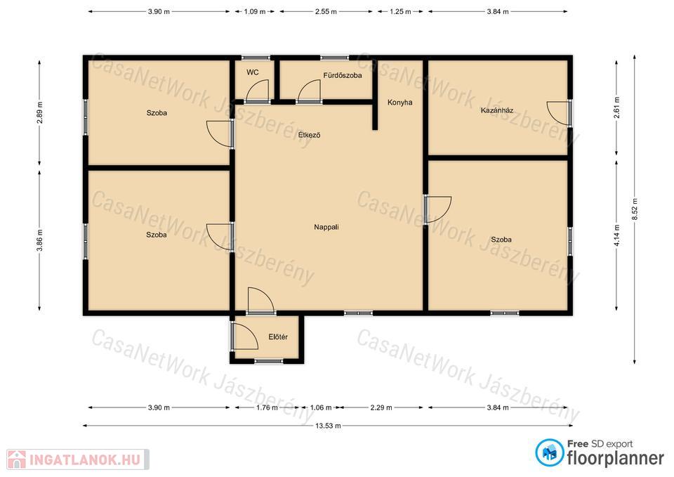 - helységek: előtér, 3 szoba , nappali (étkező), konyha, fürdőszoba, wc,