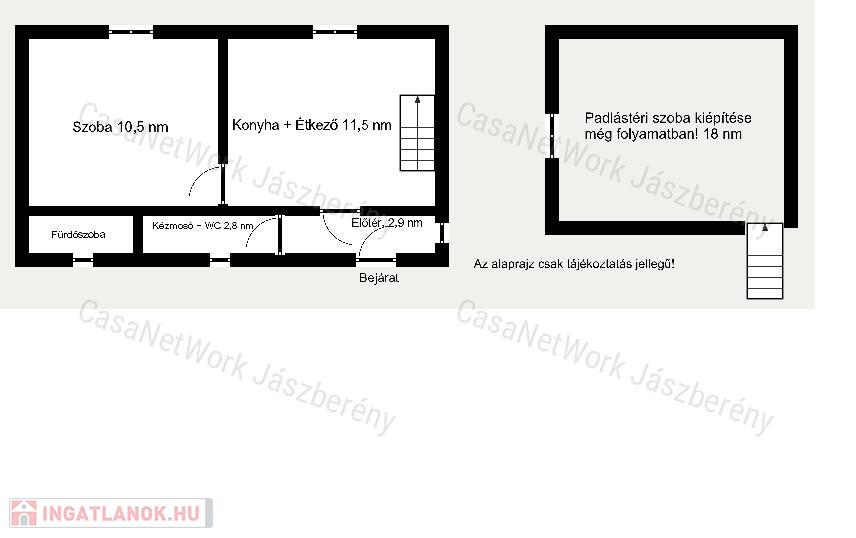 - a 30 m2-es földszinten előtér, konyha, szoba, fürdőszoba + WC,