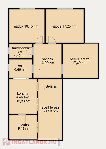 - Az ingatlanban található helyiségek: szobák (16,40 m2, 17,25 m2 és 9,45 m2) laminált padlóburkolattal, nappali 13 m2 laminált padlóburkolattal, hall 6,65 m2 járólap padlóburkolattal, konyha és étkező 13,30 m2 járólap padlóburkolattal, fürdőszoba és WC 4,40 m2 járólap padlóburkolattal, fedett teraszok (21,50 m2 és 17,60 m2) járólap és beton padlóburkolattal.