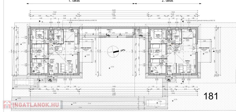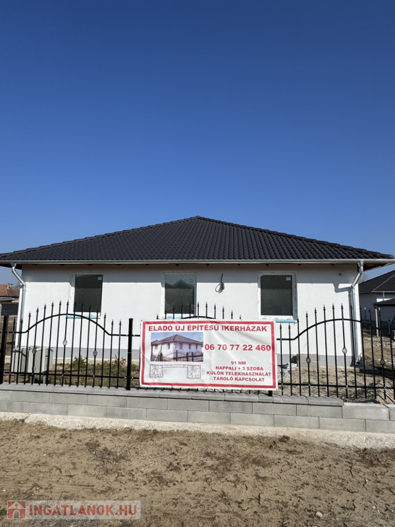 Mindkét lakás 91 m2, 10 m2 tárolóval kapcsolódik, telek 400 m2, ára: 89,9 millió Ft.