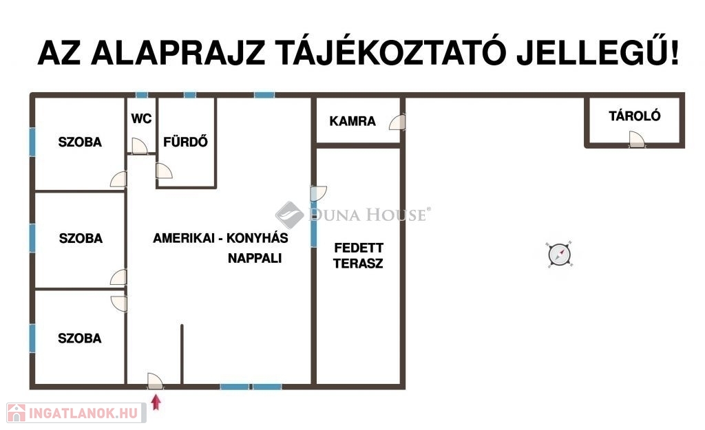 Helyiségeket tekintve az ingatlan rendelkezik 3 külön nyíló hálószobával, egy amerikai-konyhás nappalival és étkezővel, fürdővel és külön WC-vel és egy előtérrel.