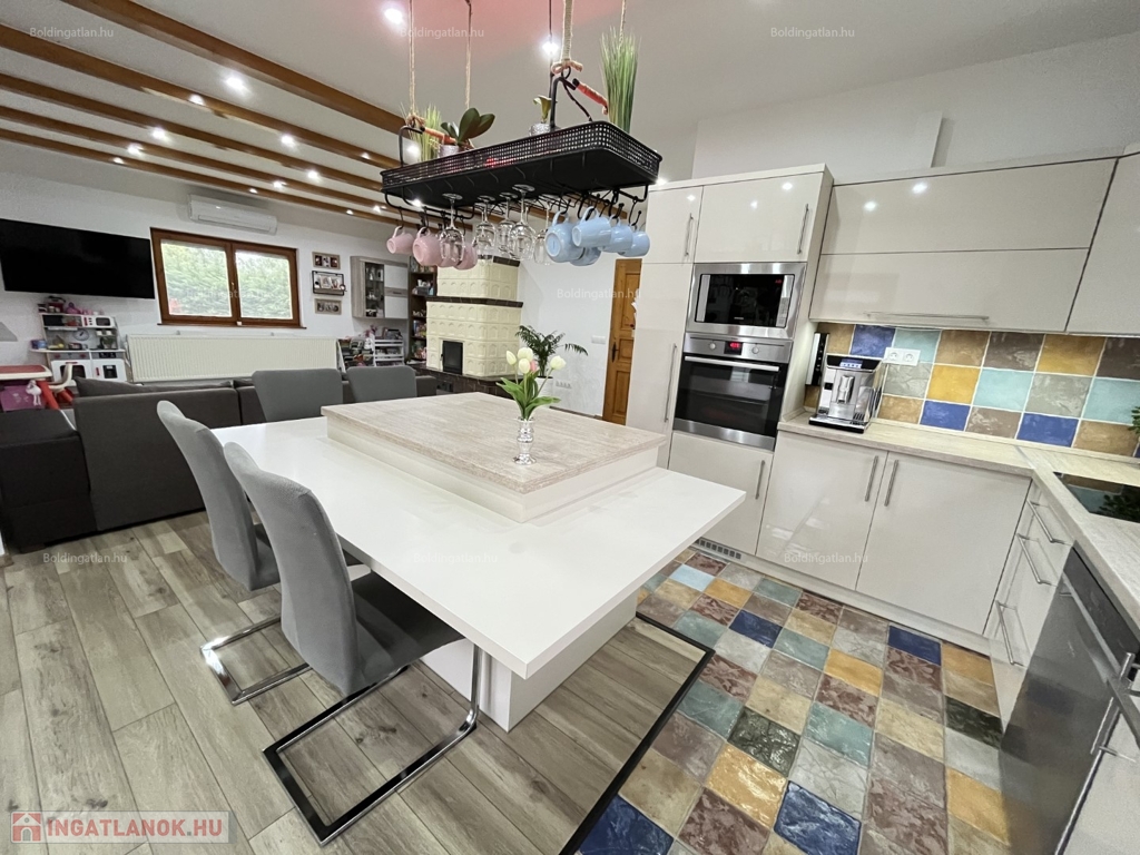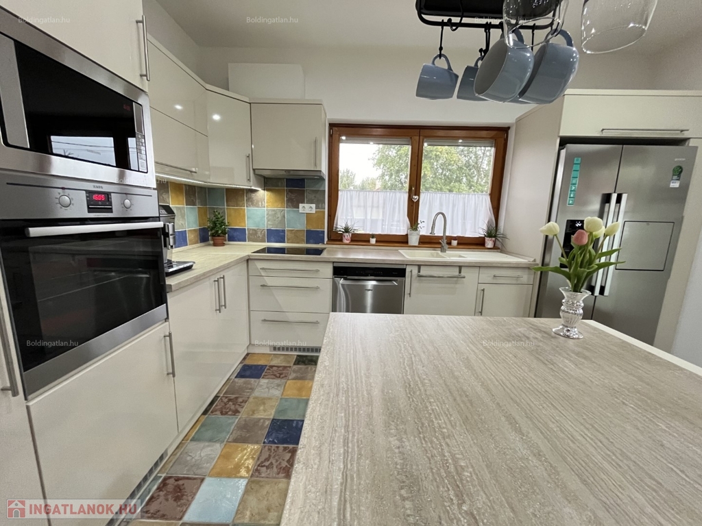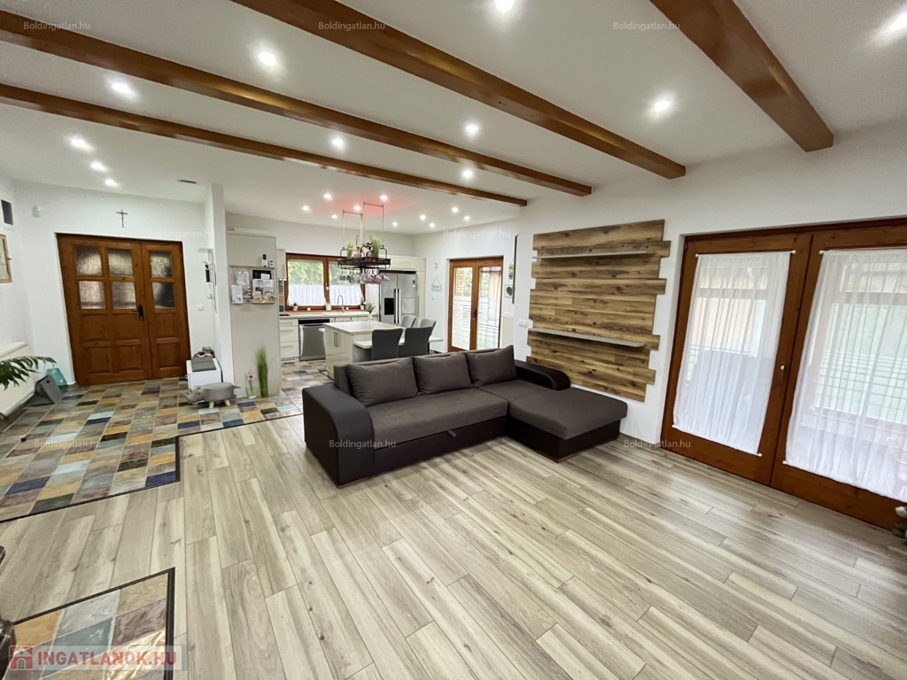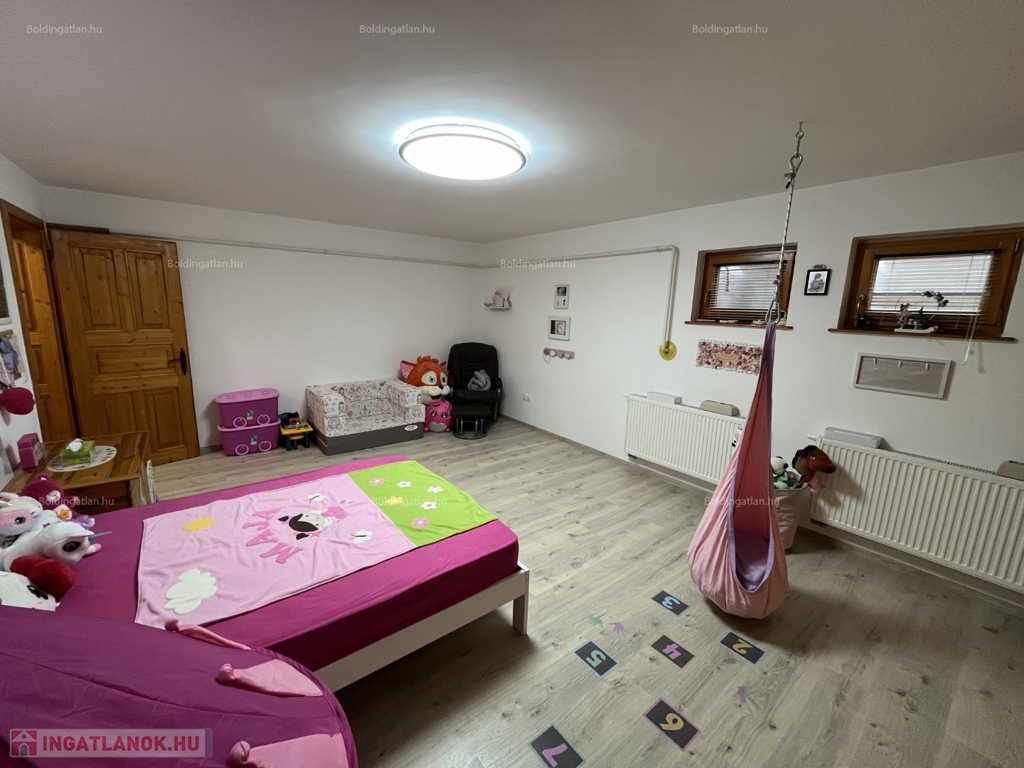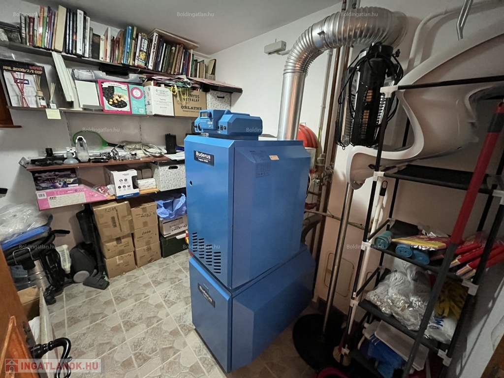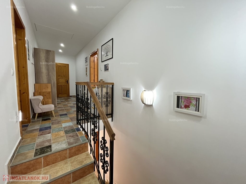Kaposmérőben - Kaposvártól csupán 8 km távolságra - csendes utcában található, igényes kivitelben 30 cm-es Ytong téglából megépített 229 m2 összalapterületű családi ház eladó. A lakóházban előszoba, tágas légkondicionált nappali-étkezőkonyha beépített konyhabútorral és gépekkel, hangulatos meleget adó cserépkályhával találhatóak, valamint a nappaliból nyílik a téli kert, illetve konyhából és a téli kerten keresztül lehet kijutni a ház déli és nyugati oldalát ölelő teraszra. A nappali felől egy folyosón keresztül közelíthető meg a szülői hálószoba, amelyből nyílik a szülői fürdőszoba wc-vel és bidével, illetve a folyosó végén található a vendégek részére kialakított wc-kézmosó helyiség, tovább a 2 személyautó részére nagyon kényelmes 37 m2-es duplagarázs is, amelyben rengeteg polc van az időszakosan szükséges holmik tárolására. Az alsó szinten kapott helyet további 2 szoba, egy dolgozószoba, valamint egy fürdőszoba-zuhanyzó helyiség, amelyben egy új 2 személyes szaunát épített be a tulajdonos, továbbá itt található még a mosókonyha, és a kazánház is. A ház fűtése és a melegvíz ellátása Buderus melegvíztárolós kombi gázkazánnal megoldott, valamint a nappaliban 5.5 kW-os Gree típusú légkondicionáló is felszerelésre került. A lakóház tulajdonosai a házban a villanyvezetékeket kicseréltették (3x25 A, 380V állnak rendelkezésre), WiFi rendszert építettek ki, távirányítású automata alumínium redőnyöket - szúnyoghálóval -, valamint BWT típusú vízlágyítót szereltettek fel, applikációról működő kamerás riasztó rendszert építettek ki, továbbá automata kaput és garázsajtók fokozzák a kényelmet. Telek: 1.672 m2 Az ár tartalmazza a teljes berendezést is! Az ingatlan vételárába a tulajdonos kaposvári lakást beszámít! Energetikai besorolás: C.