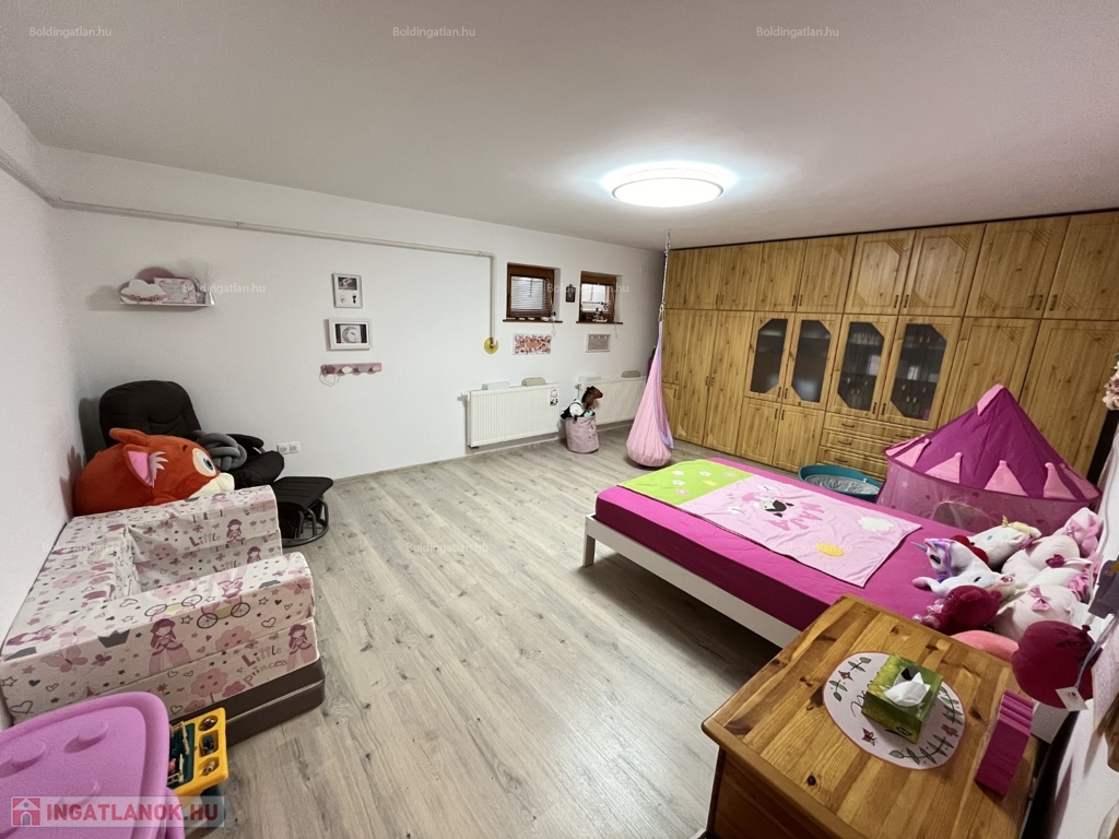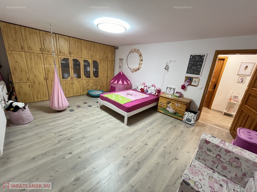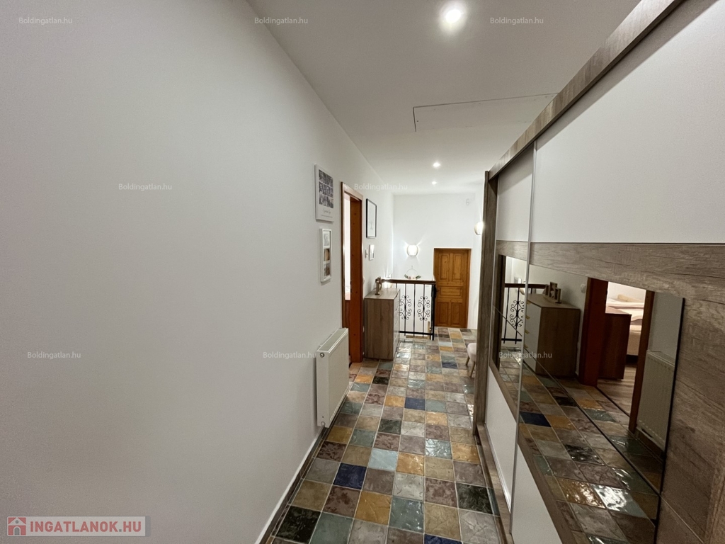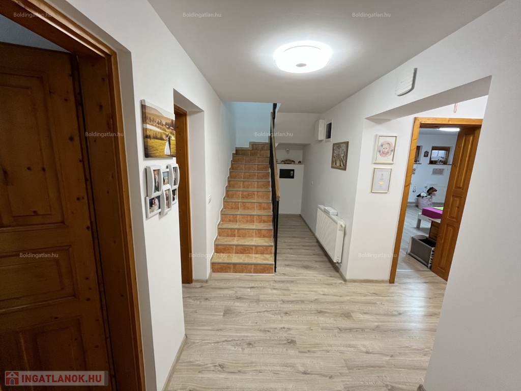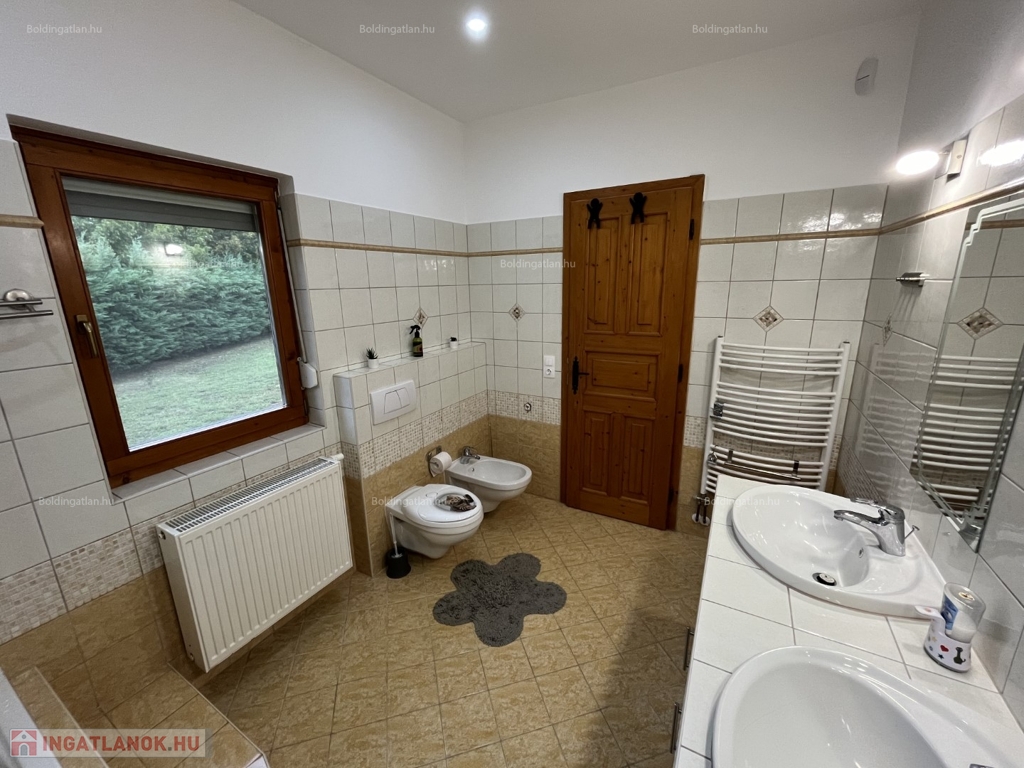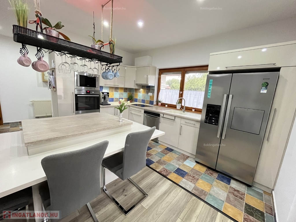 Kaposmérőben - Kaposvártól csupán 8 km távolságra - csendes utcában található, igényes kivitelben 30 cm-es Ytong téglából megépített 229 m2 összalapterületű családi ház eladó. A lakóházban előszoba, tágas légkondicionált nappali-étkezőkonyha beépített konyhabútorral és gépekkel, hangulatos meleget adó cserépkályhával találhatóak, valamint a nappaliból nyílik a téli kert, illetve konyhából és a téli kerten keresztül lehet kijutni a ház déli és nyugati oldalát ölelő teraszra. A nappali felől egy folyosón keresztül közelíthető meg a szülői hálószoba, amelyből nyílik a szülői fürdőszoba wc-vel és bidével, illetve a folyosó végén található a vendégek részére kialakított wc-kézmosó helyiség, tovább a 2 személyautó részére nagyon kényelmes 37 m2-es duplagarázs is, amelyben rengeteg polc van az időszakosan szükséges holmik tárolására. Az alsó szinten kapott helyet további 2 szoba, egy dolgozószoba, valamint egy fürdőszoba-zuhanyzó helyiség, amelyben egy új 2 személyes szaunát épített be a tulajdonos, továbbá itt található még a mosókonyha, és a kazánház is. A ház fűtése és a melegvíz ellátása Buderus melegvíztárolós kombi gázkazánnal megoldott, valamint a nappaliban 5.5 kW-os Gree típusú légkondicionáló is felszerelésre került. A lakóház tulajdonosai a házban a villanyvezetékeket kicseréltették (3x25 A, 380V állnak rendelkezésre), WiFi rendszert építettek ki, távirányítású automata alumínium redőnyöket - szúnyoghálóval -, valamint BWT típusú vízlágyítót szereltettek fel, applikációról működő kamerás riasztó rendszert építettek ki, továbbá automata kaput és garázsajtók fokozzák a kényelmet. Telek: 1.672 m2 Az ár tartalmazza a teljes berendezést is! Az ingatlan vételárába a tulajdonos kaposvári lakást beszámít! Energetikai besorolás: C.