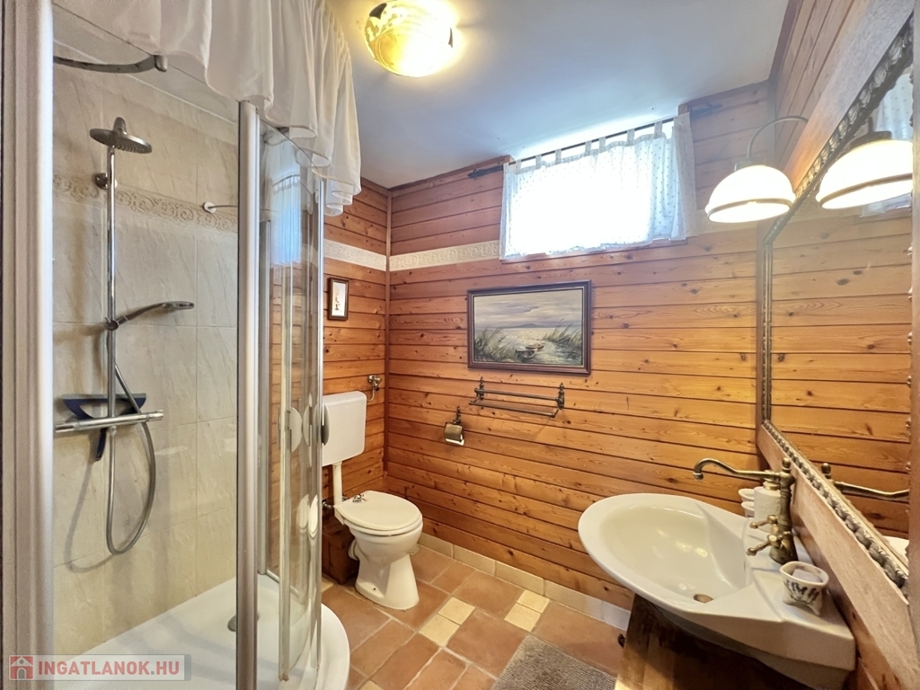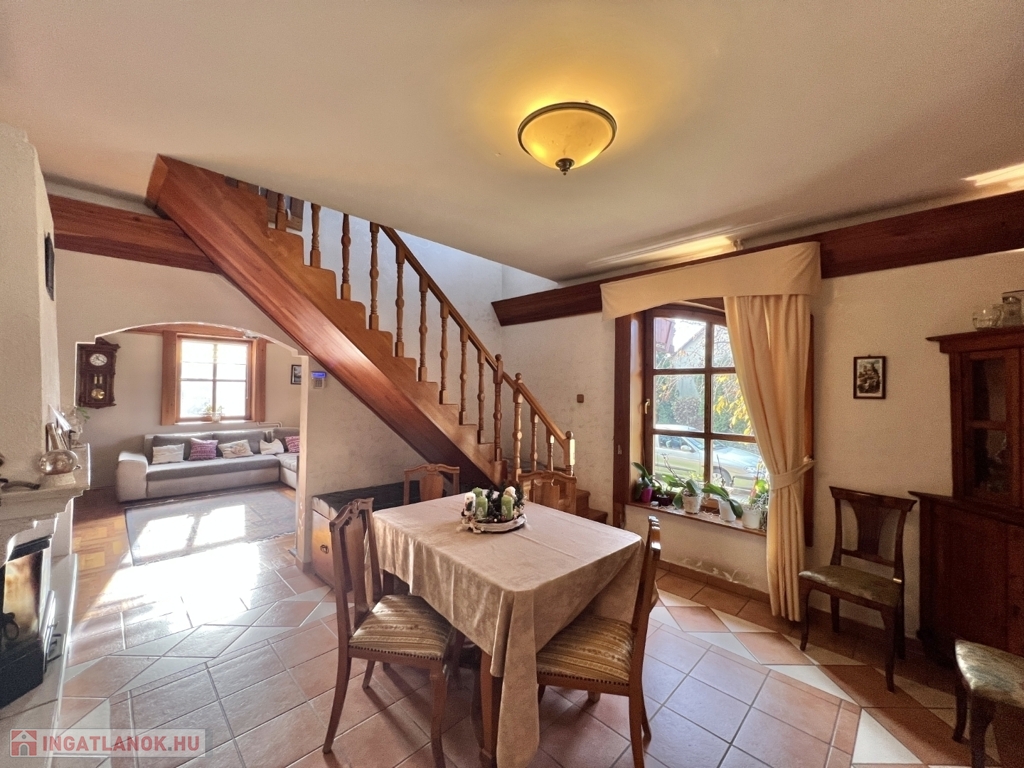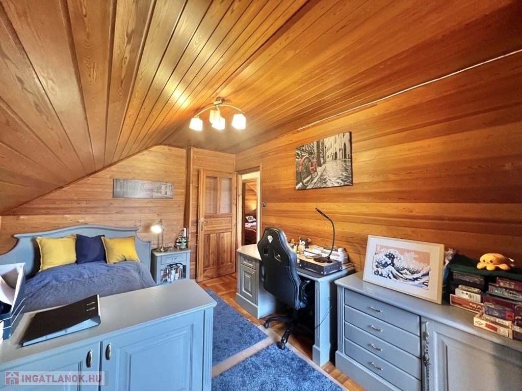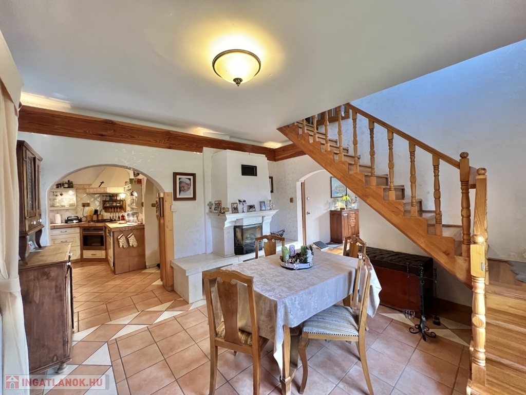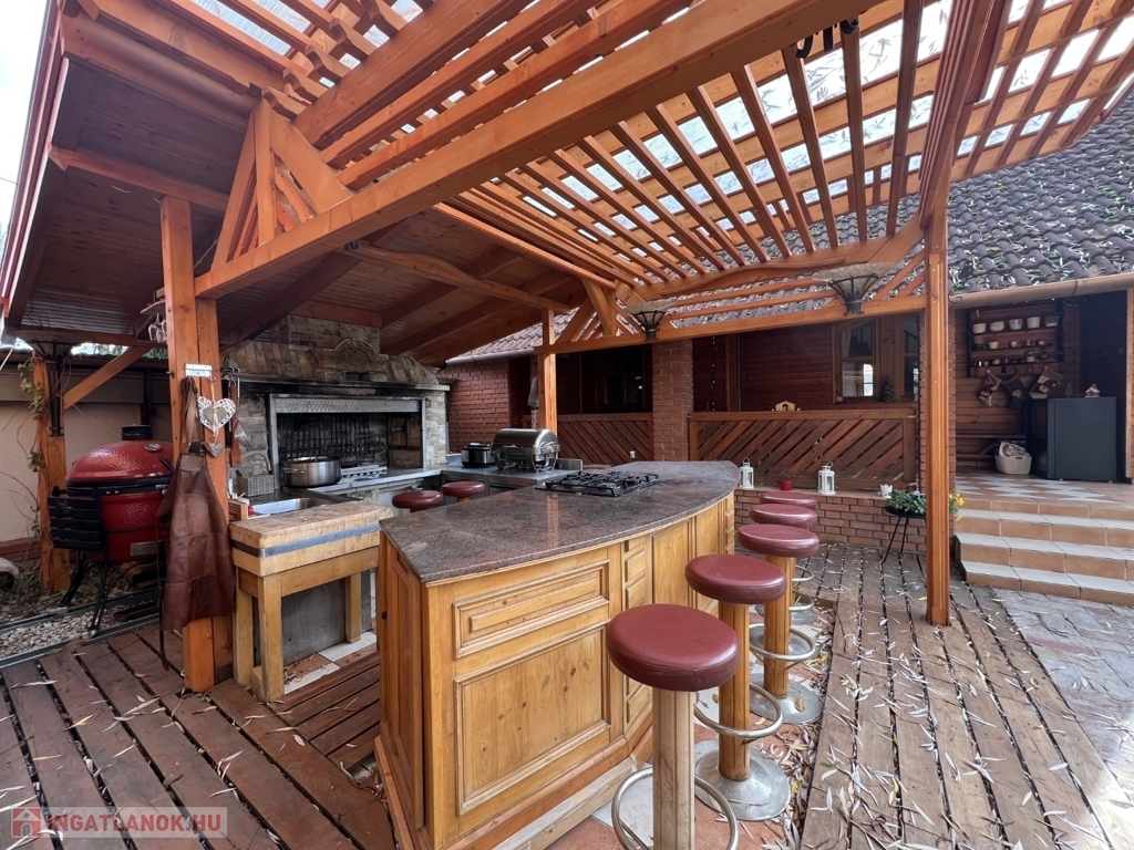 Kaposváron a Toponár városrészben - kifejezetten csendes környezetben lévő - rusztikus stílusban igényesen kialakított hangulatos 160 m2-es családi ház, különálló fedett grillterasszal, - külön lakrészként, vagy vállalkozásnak is használható - 1 szobás mellépülettel, és duplagarázzsal együtt eladó. A lakóház alsó szintjén tágas nappali, étkező, konyha-spájz, fürdőszoba-wc, előszoba, gardrób, továbbá belső udvar felé néző fedett terasz helyiségek kerültek kialakításra, valamint az épület alatt pince, kazánház helyiségek vannak. A tetőtérben 3 szoba-erkély, fürdőszoba-wc, továbbá gardrób helyiségek vannak, az épület fűtése gázközponti és vegyestüzelésű kazánnal, a melegvíz ellátása villanybojlerrel megoldott. A lakóház mögött az udvaron különálló - jelenleg irodának kialakított - melléképület található, amelyben 1 szoba, jelenleg tároló helyiség, wc, valamint szauna-mosókonyha-zuhanyzó vannak, a fűtése kályhával, gázközponti kazánnal -, valamint további igény esetén vegyestüzelésű kazánnal megoldott. Az udvarban két személyautónak alkalmas garázs, tároló-kazánház helyiségek kerültek kialakításra, illetve további gépkocsi, vagy egyéb dolgok tárolására egy 60 m2-es fedett szín is van. Telek: 2.275 m2