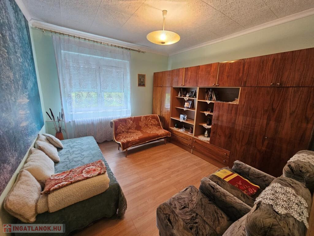 Kaposváron, a Nyugativánfa utcában kínáljuk megvételre ezt a kétszoba hallos, jó állapotú családi házat. Lakóterülete 63 m2, amihez még hozzáadódik a kazánház és a teraszból leválasztott előtér. Ezen kívül több, tárolóként, műhelyként használható melléképület, pince és garázs áll rendelkezésre. A ház bejárata hátul, a teraszról vezet be az előtéren keresztül a hallba. Innen nyílik szemben egymás mellett a két tágas szoba, balra az étkezős konyha, jobbra a fürdő, és egy kis közlekedő a padlásfeljáróval, majd a WC. Központi fűtés van, ami kétféle módon is működtethető: vegyes tüzelésű kazánnal, vagy gázkazánnal. Külső szigetelést is kapott a ház, és az ablakok zöme új, műanyag keretes. Nem szokványos, hogy a ház az utcafronttól bőven beljebb épült, ezért a telek nagyobb része a ház előtt helyezkedik el. Ez a terület egészen enyhén emelkedik a ház felé, igazán szépen gondozott. Találunk itt gyümölcsfákat és füves, virágos részeket. A ház mögött viszont meredekebb, teraszos kialakítású a terep. Lent, az utcához közel egy árok is keresztülfolyik a területen. A telek 1476 m2. A környék nyugodt, családi házas övezet, a ház és a kert hangulatos, barátságos.