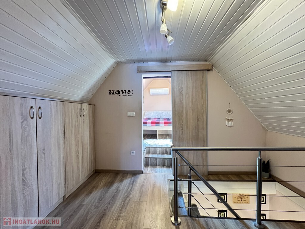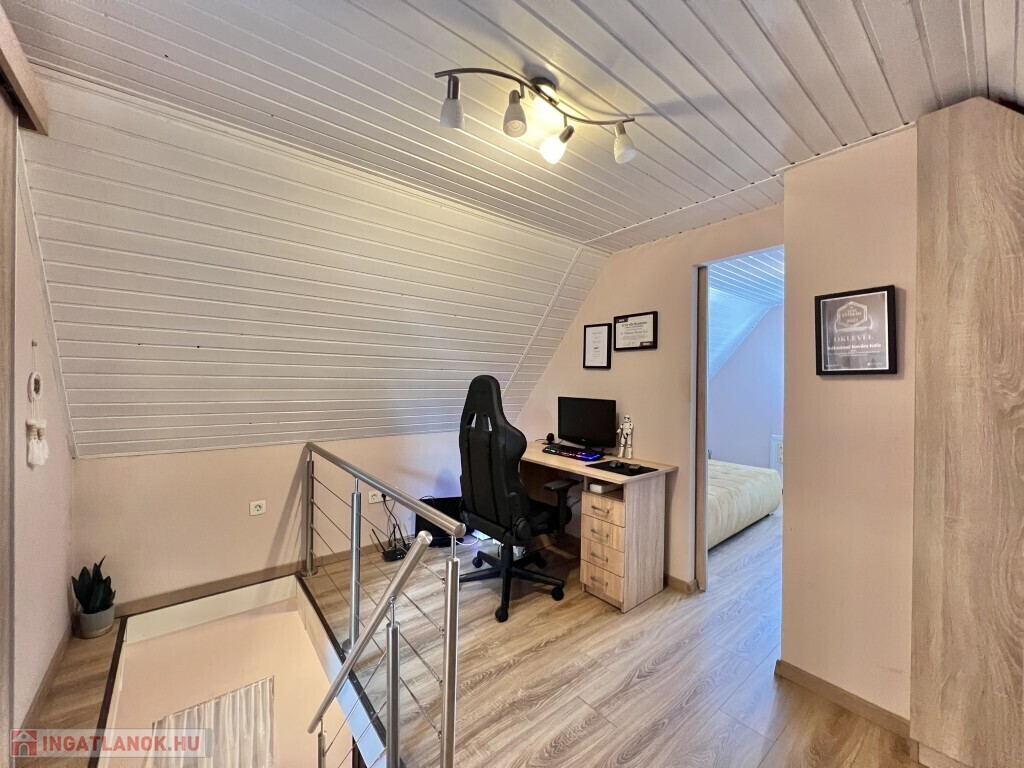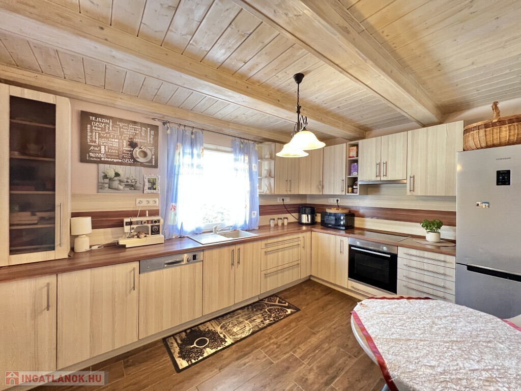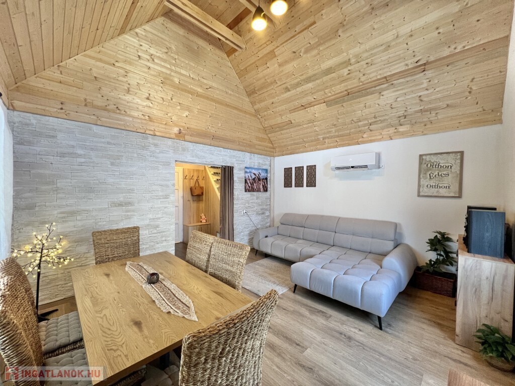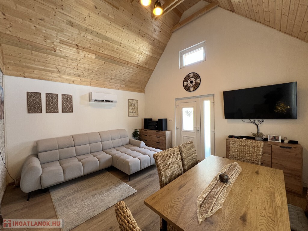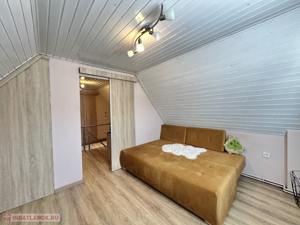 Kaposváron a Zselic kertváros egyik csendes kis utcájában található, aszfaltos úton megközelíthető kedves hangulatú, otthonosan kialakított lakóházként használt hétvégi ház eladó. Az épület alsó szintjén nappali-étkező, konyha, fürdőszoba-wc helyiség található, míg a padlástérben további 2 szobát alakított ki a tulajdonosa. Az épület - ahogyan a képeken is látható - nagyon jó műszaki állapotban van, a nyílászárók műanyagok, az épület kívülről 10 cm. hőszigetelést kapott, a fűtése vegyes központi fűtéssel megoldott, a nappaliban és a két felső szobában 1-1 légkondicionáló van felszerelve a komfort növelése miatt, illetve a meleg vizet intelligens Ariston villanybojler biztosítja, illetve kamerarendszer van kiépítve. A kazánház mellett mosókonyha, és további műhely is található. A ház alatt 8 m2-es pince található, az önálló kerti lakrész klímával fűthető és egy szauna is megtalálható mellette. Az igényesen kialakított udvarban 2 személyautó részére fedett beálló van. Telek: 772