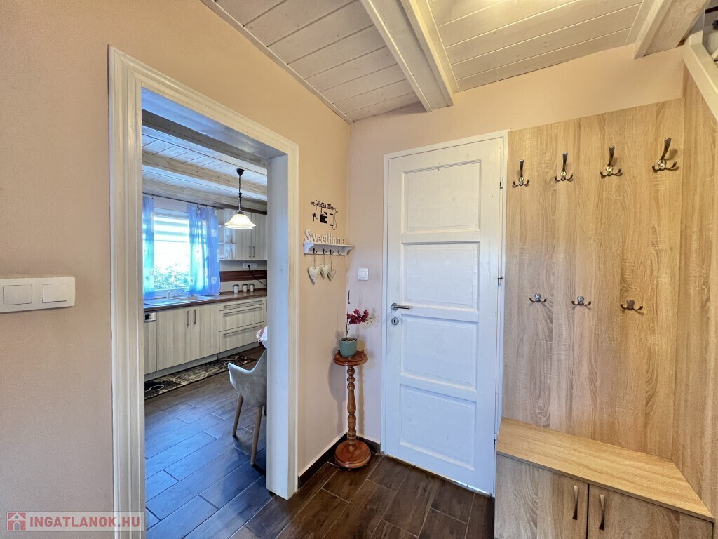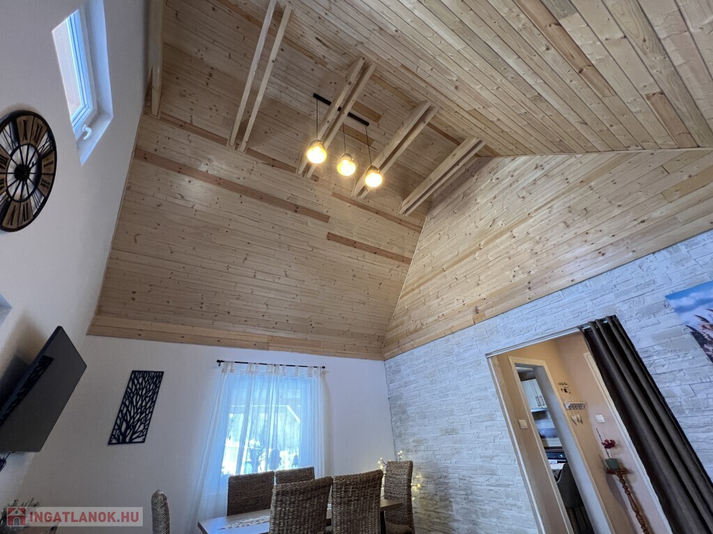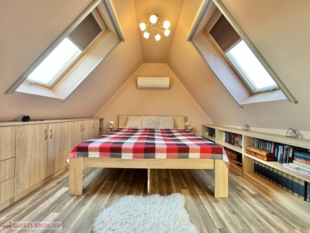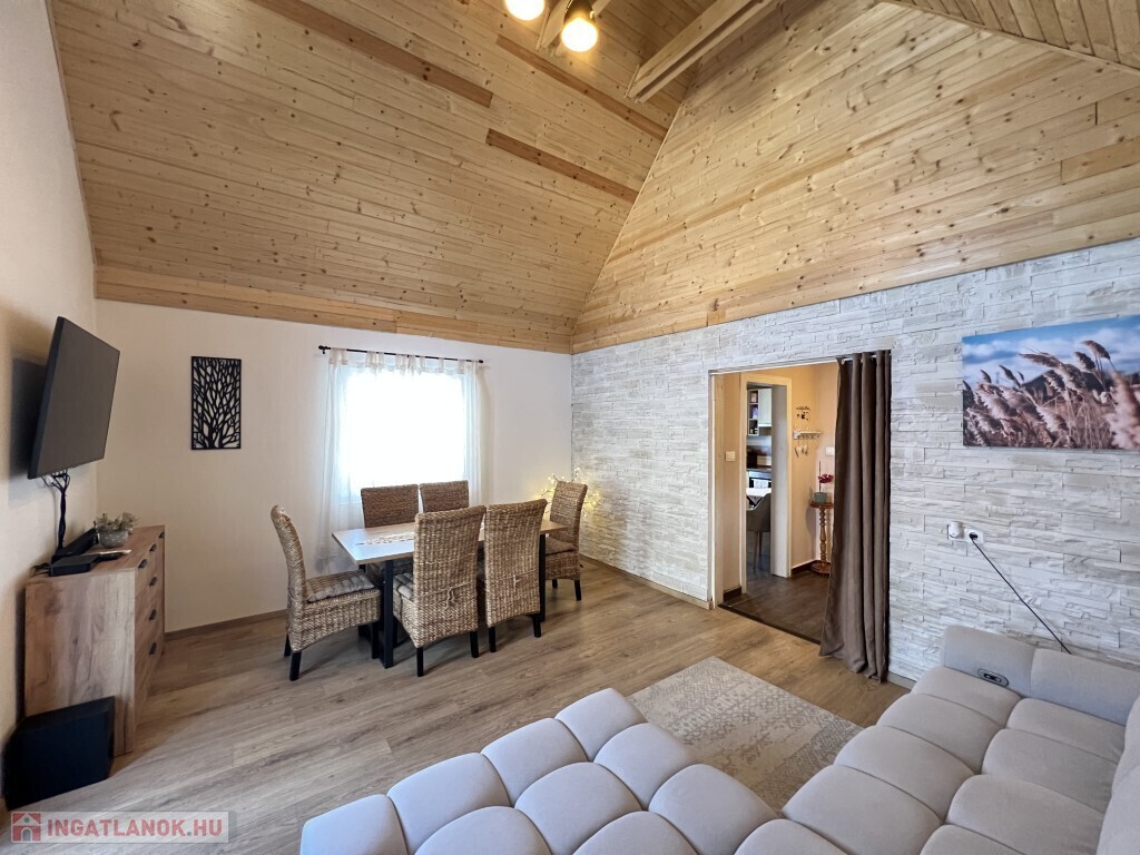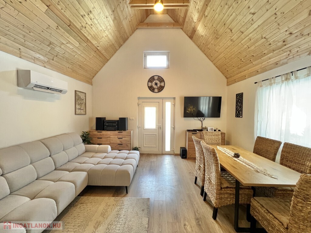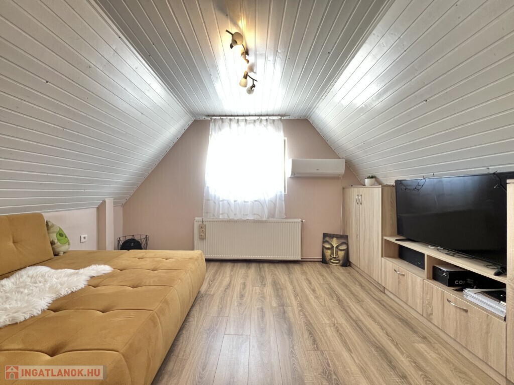 Kaposváron a Zselic kertváros egyik csendes kis utcájában található, aszfaltos úton megközelíthető kedves hangulatú, otthonosan kialakított lakóházként használt hétvégi ház eladó. Az épület alsó szintjén nappali-étkező, konyha, fürdőszoba-wc helyiség található, míg a padlástérben további 2 szobát alakított ki a tulajdonosa. Az épület - ahogyan a képeken is látható - nagyon jó műszaki állapotban van, a nyílászárók műanyagok, az épület kívülről 10 cm. hőszigetelést kapott, a fűtése vegyes központi fűtéssel megoldott, a nappaliban és a két felső szobában 1-1 légkondicionáló van felszerelve a komfort növelése miatt, illetve a meleg vizet intelligens Ariston villanybojler biztosítja, illetve kamerarendszer van kiépítve. A kazánház mellett mosókonyha, és további műhely is található. A ház alatt 8 m2-es pince található, az önálló kerti lakrész klímával fűthető és egy szauna is megtalálható mellette. Az igényesen kialakított udvarban 2 személyautó részére fedett beálló van. Telek: 772