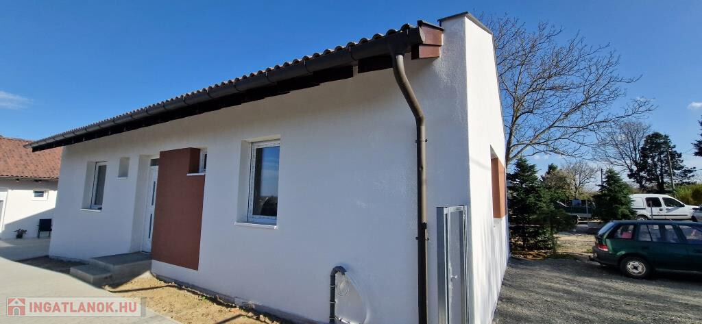 Kaposváron, a Kaposhegy utcában kínáljuk megvételre ezt a kivitelezés alatt álló újépítésű családi házat. Hivatalosan egy ikerház utcafronti része, gyakorlatilag teljesen önálló épület egy összközműves belterületi telken. Alapterülete 90 m2, délre néző 25 m2-es terasszal, 2 db gépkocsibeállóval, 387,6 m2-es saját kertrésszel. Jelenleg kb. 75 %-os készültségi fokban van, vagyis kívülről kész, belül válaszfalazásra vár. Az ár ezt az állapotot tartalmazza, de a kivitelező megegyezés szerint kulcsrakészre befejezi. A belső válaszfalak műszaki kötöttségek figyelembe vételével még természetesen alakíthatók. A tervek szerint praktikus az elrendezés, a ház egyik felében lesz a tágas amerikai konyhás nappali, azaz a közösségi tér, a másik oldalon három külön bejáratú hálószoba és a fürdő, azaz a privát szféra. A teraszra ki lehet menni a nappaliból és két szobából is.